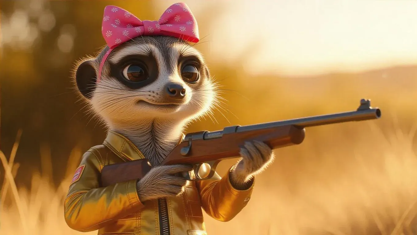 A thoughtful meerkat stands at the shooting line, its bright pink bow perched atop its head. The meerkat wears a golden shooting jacket, with soft brown fur. It grips a competition-grade BB rifle, its eyes locked on the target with unwavering concentration. The background is a savannah shooting range, ensuring the focus remains entirely on the meerkat. The lighting is warm and golden, casting no shadows, enhancing the hyperrealistic, Pixar-style rendering.