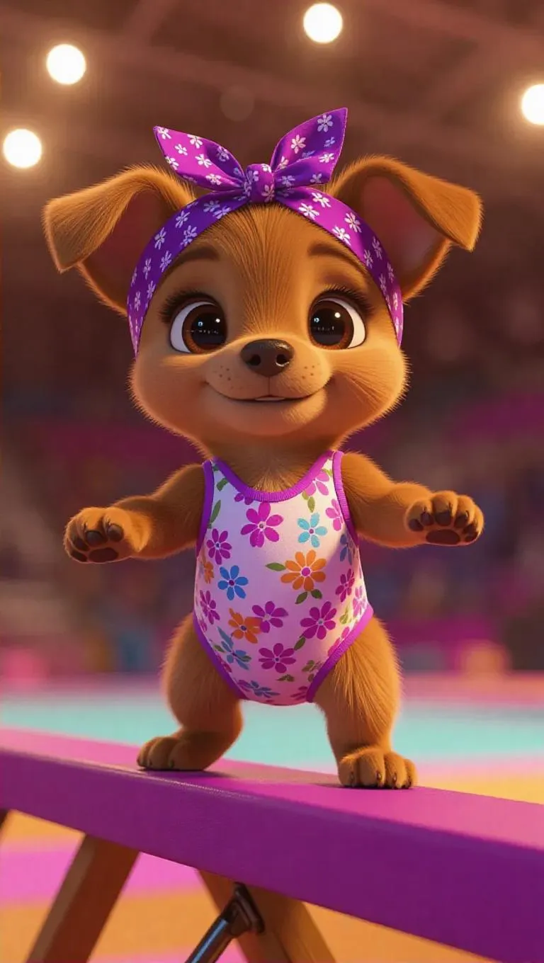 A playful little puppy stands on a balance beam, its purple bandana perched atop its head. The puppy wears a pink floral gymnastics leotard, with soft brown ears and paws. Its eyes are sparkling, and it appears to be getting ready for a spectacular flip. The background is a colorful gymnastics arena, ensuring the focus remains entirely on the puppy. The lighting is warm and inviting, casting soft shadows, enhancing the charming, cartoon-style rendering.