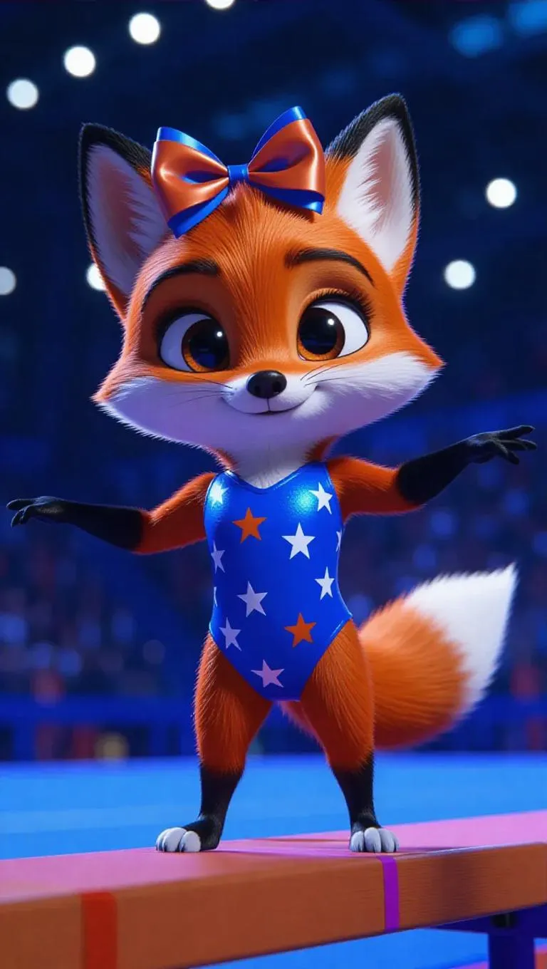 A charming little fox stands on a balance beam, its orange bow perched atop its head. The fox wears a blue star-patterned gymnastics leotard, with soft white ears and paws. Its eyes are determined, and it appears to be preparing for a daring twist. The background is a modern gymnastics arena, ensuring the focus remains entirely on the fox. The lighting is dynamic and energetic, enhancing the thrilling, animated rendering.