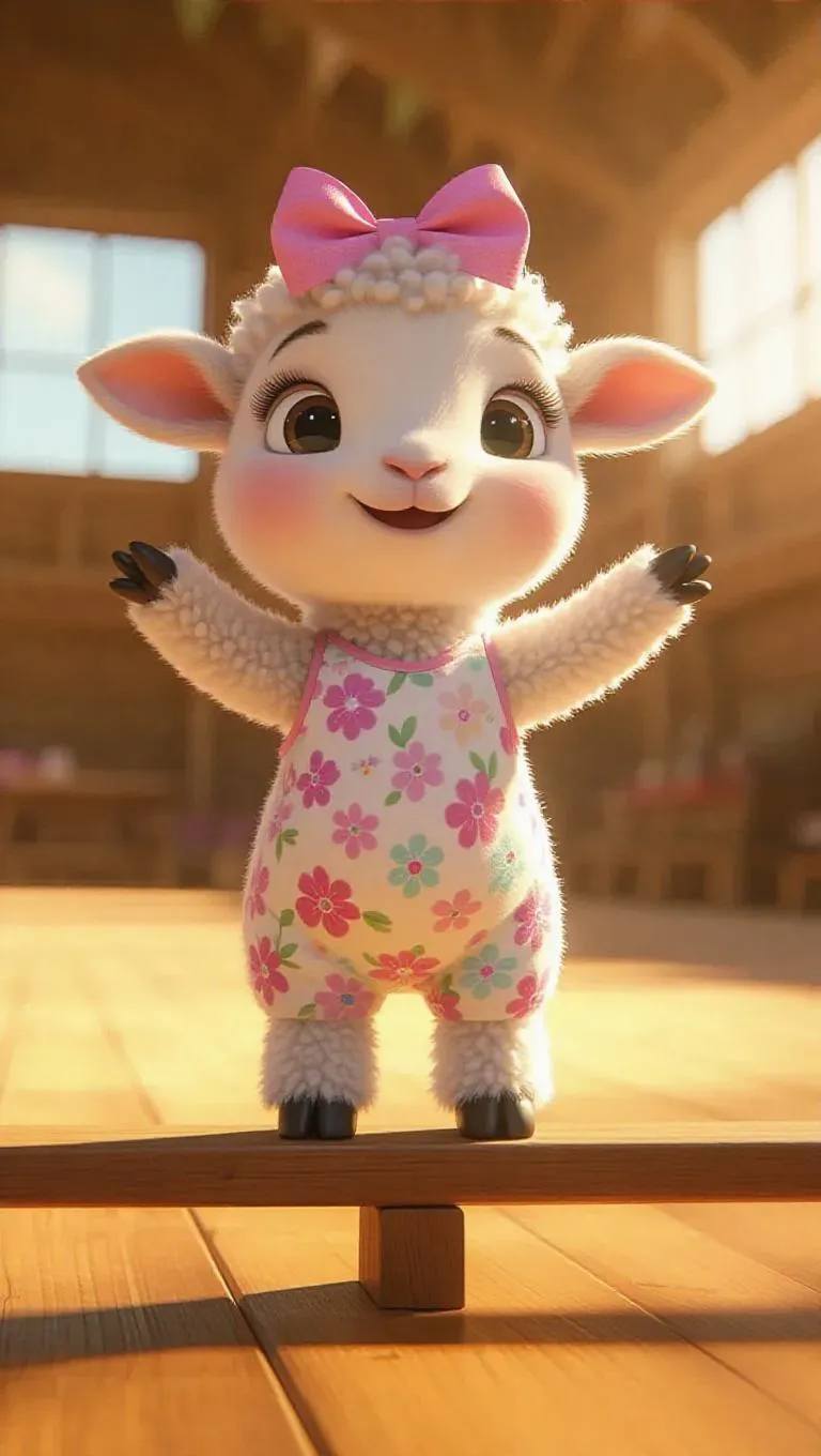 A spirited little lamb stands on a balance beam, its pink bow on its head. The lamb wears a floral-print gymnastics leotard, with fluffy white wool and hooves. Its eyes are curious, and it appears to be about to execute an elegant flip. The background is a sunny gymnastics arena, ensuring the focus remains entirely on the lamb. The lighting is golden and warm, enhancing the friendly, animated rendering.