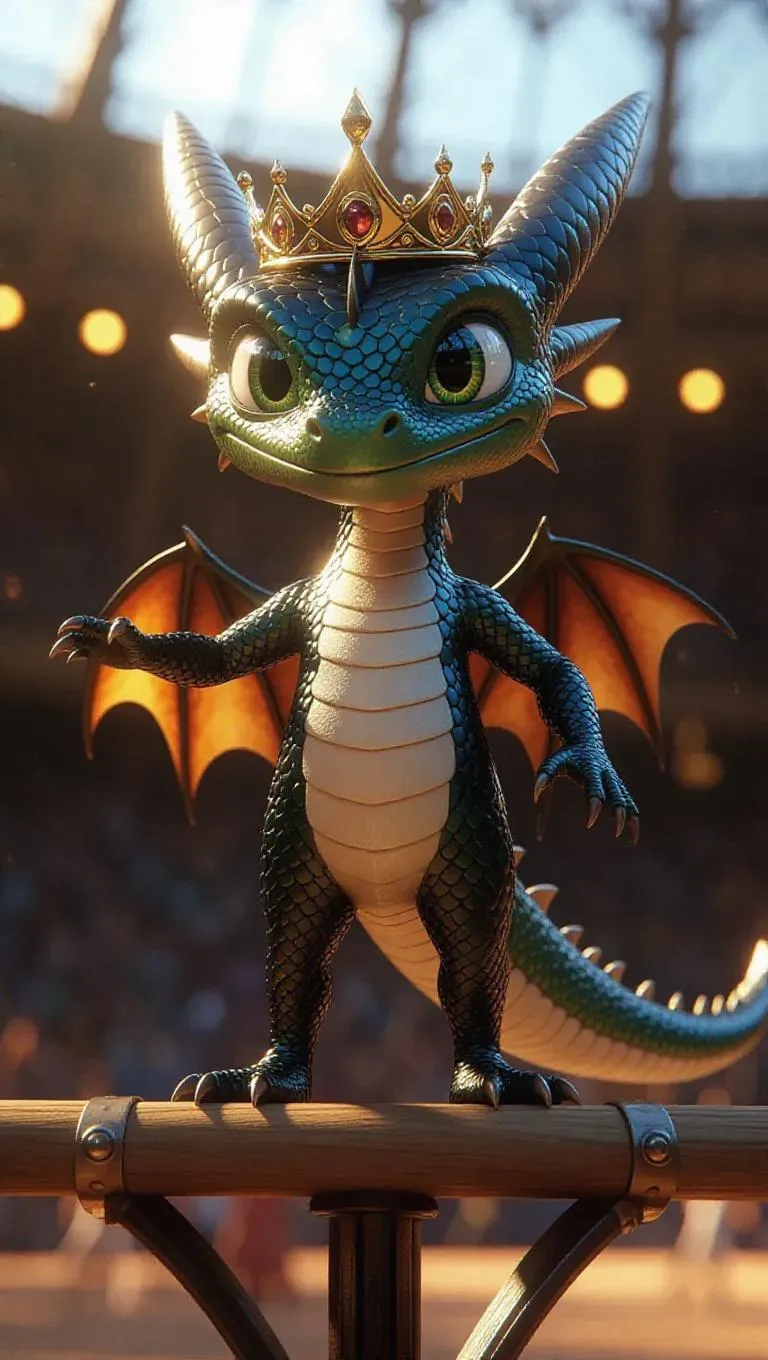 A delightful little dragon stands on a balance beam, its golden crown sitting atop its head. The dragon wears a black and silver gymnastics leotard, with colorful scales. Its eyes are fierce, and it appears to be preparing for a fiery routine. The background is a mythical gymnastics arena, ensuring the focus remains entirely on the dragon. The lighting is mystical and shimmering, enhancing the magical, cartoon-style rendering.