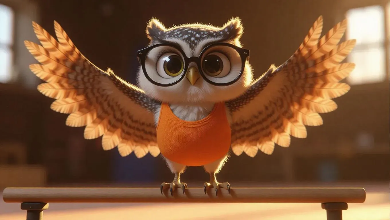 A small little owl stands on a balance beam, its cute glasses perched on its beak. The owl wears a cozy orange gymnastics leotard, with big fluffy wings. Its eyes are observant, and it appears to be preparing for a thoughtful routine. The background is a tranquil gymnastics arena, ensuring the focus remains entirely on the owl. The lighting is soft and cozy, enhancing the whimsical, cartoonish rendering.