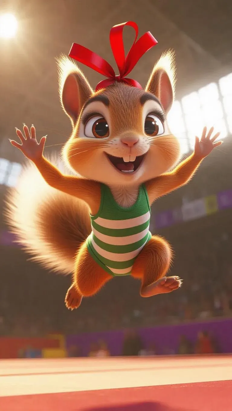 A lively little squirrel leaps through the air on a vault, its red ribbon adorning its head. The squirrel wears a green striped gymnastics leotard, with fluffy white ears and paws. Its eyes sparkle with excitement, as it is mid-flight. The background is a vibrant gymnastics arena, ensuring the focus remains entirely on the squirrel. The lighting is warm and bright, casting soft shadows, enhancing the animated, DreamWorks-style rendering.