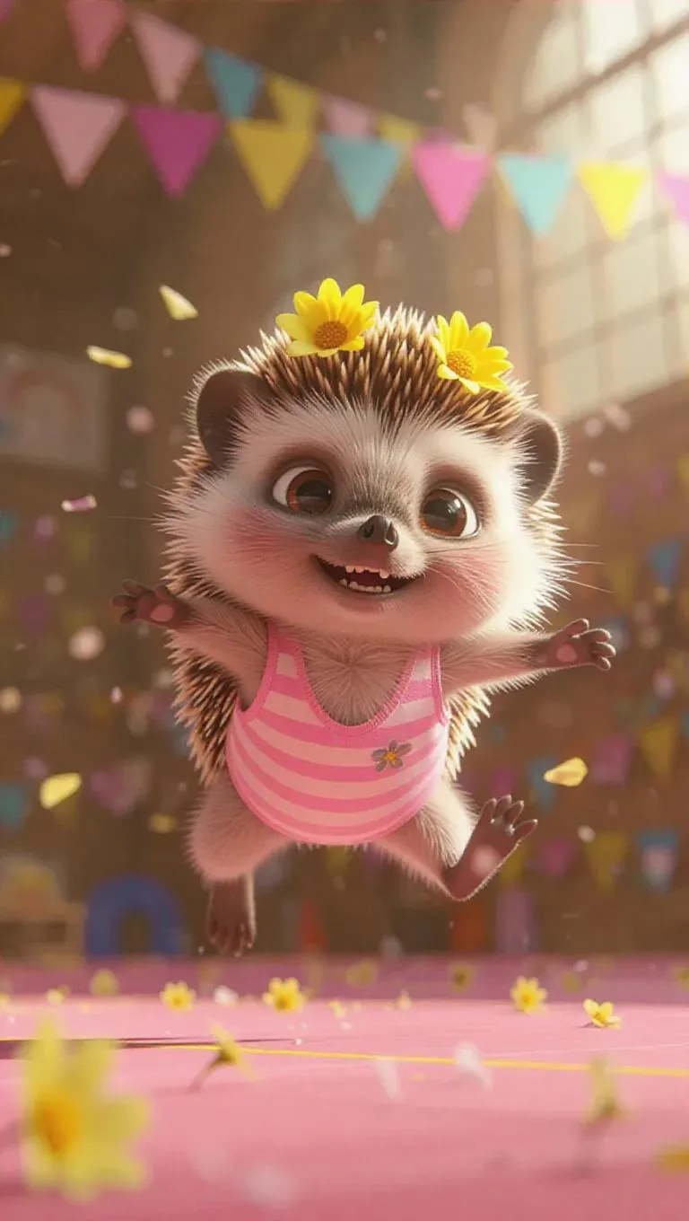 An adorable little hedgehog rolls through the air on a vault, its yellow flower crown perched atop its head. The hedgehog wears a pink stripes gymnastics leotard, with soft brown quills. Its eyes are wide with determination, as it is mid-flight. The background is a whimsical gymnastics arena, ensuring the focus remains entirely on the hedgehog. The lighting is soft and diffused, casting light pastel shadows, enhancing the cartoonish, Aardman-style rendering.