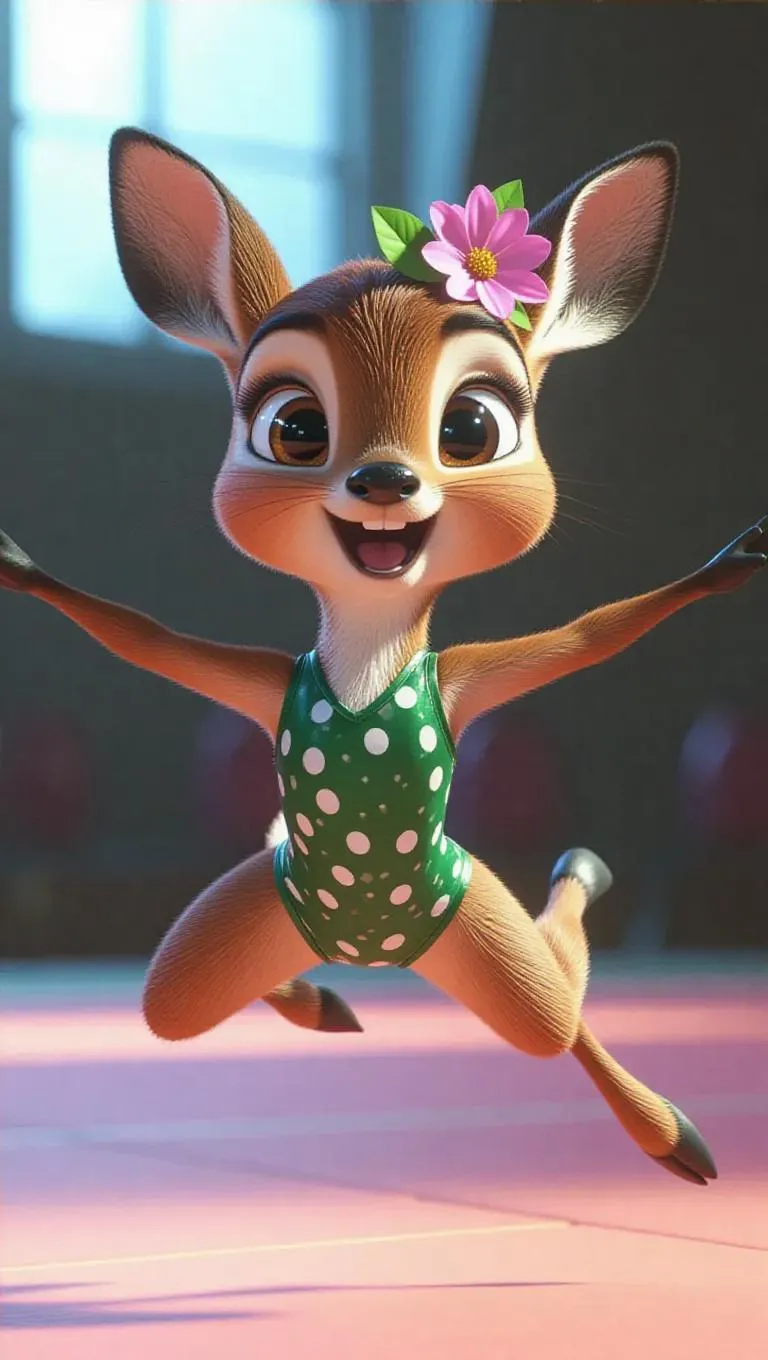 An enthusiastic little deer leaps through the air on a vault, its pink flowers tucked behind its ear. The deer wears a green leaf-patterned gymnastics leotard, with soft brown spots. Its eyes shine with enthusiasm, as it is mid-flight. The background is a serene gymnastics arena, ensuring the focus remains entirely on the deer. The lighting is gentle and calming, enhancing the fairy-tale, Pixar-style rendering.