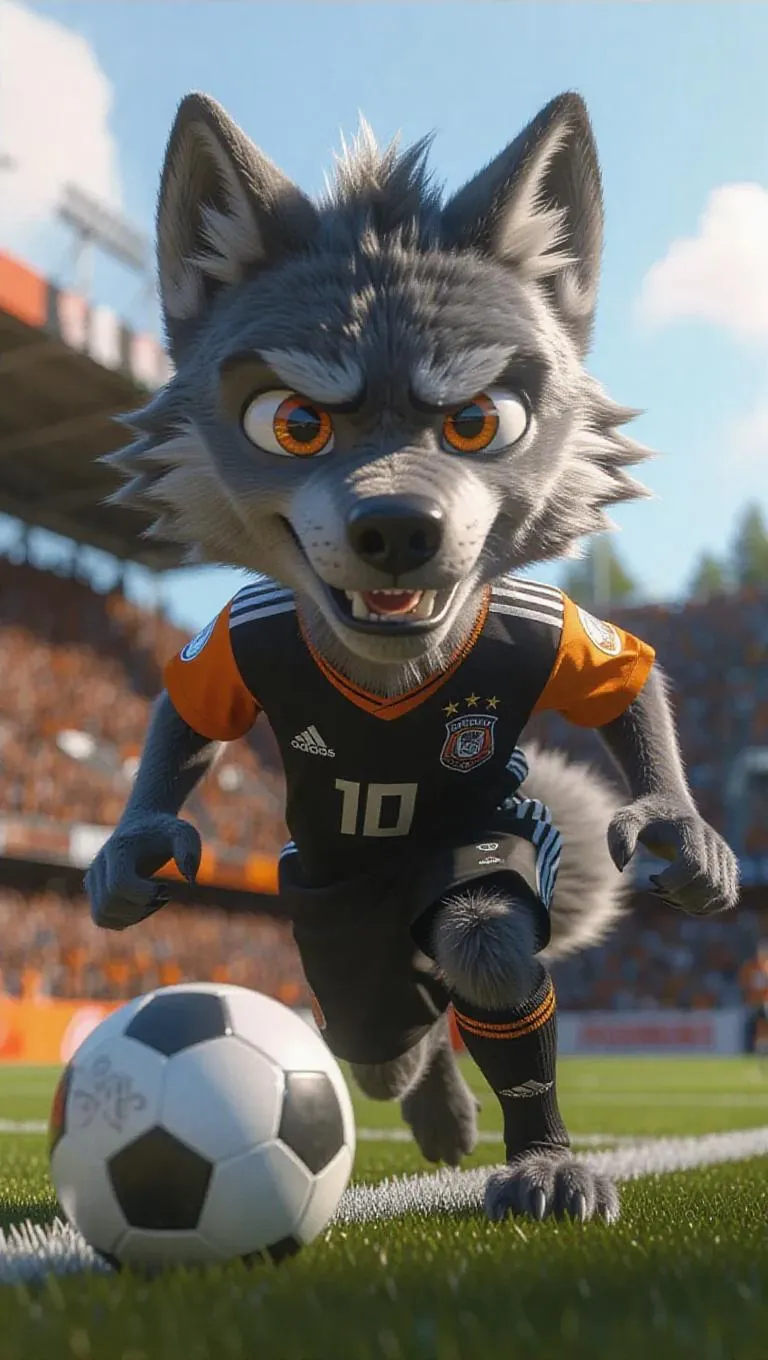 An anthropomorphic wolf with orange eyeballs, sporting a buzz cut hairstyle and a soccer jersey, featuring grey fur and a competitive expression, captured in stunning 8K resolution, exuding spirit and teamwork. The scene is set on a soccer field, with the wolf dribbling the ball, the fans rallying behind him.