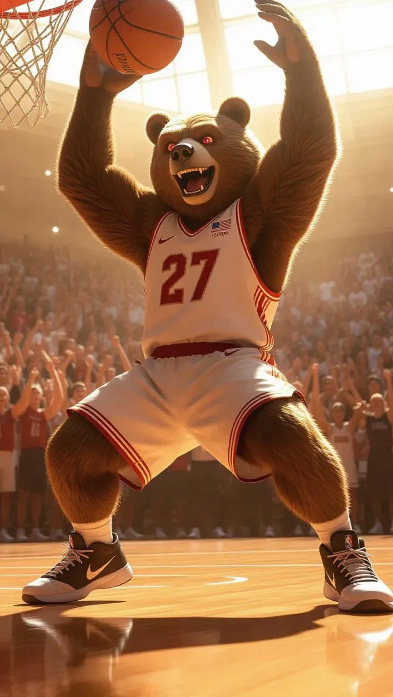 An anthropomorphic bear with red eyeballs, sporting a long hairstyle and a basketball uniform, featuring light brown fur and a confident expression, captured in stunning 8K resolution, exuding skill and agility. The scene is set on a basketball court, with the bear attempting a slam dunk, the crowd erupting in cheers.