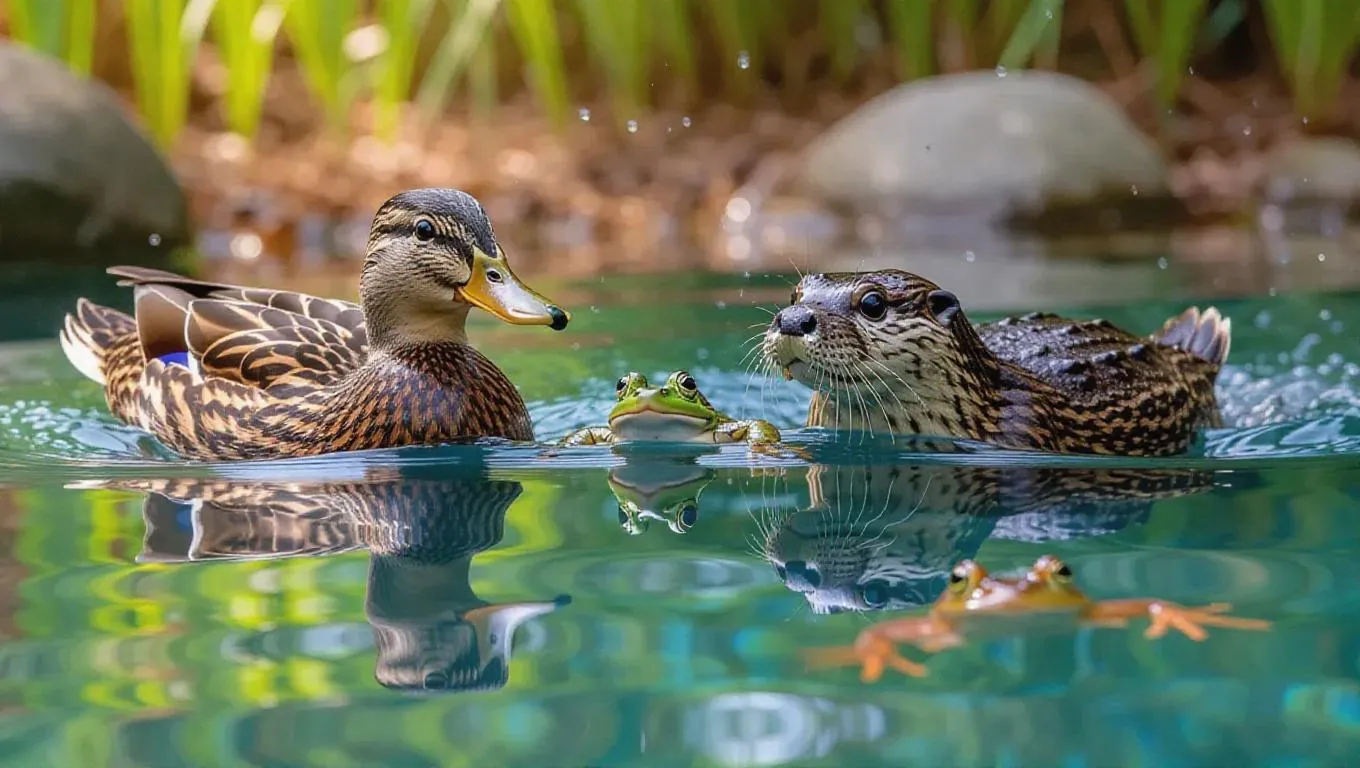 A playful swimming race in a crystal-clear pond features a duck, otter, and crab. The duck paddles swiftly, the otter glides effortlessly through the water, and the crab scuttles along the bottom. Frogs and fish cheer from the water’s edge, creating a lively and festive atmosphere.