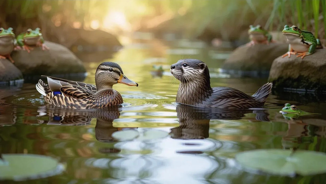 A playful swimming race in a warm pond features a duck, otter, and kitten. The duck paddles swiftly, the otter glides effortlessly through the water, and the kitten watches from a nearby rock. Frogs and fish cheer from the water’s edge, creating a lively and festive atmosphere.