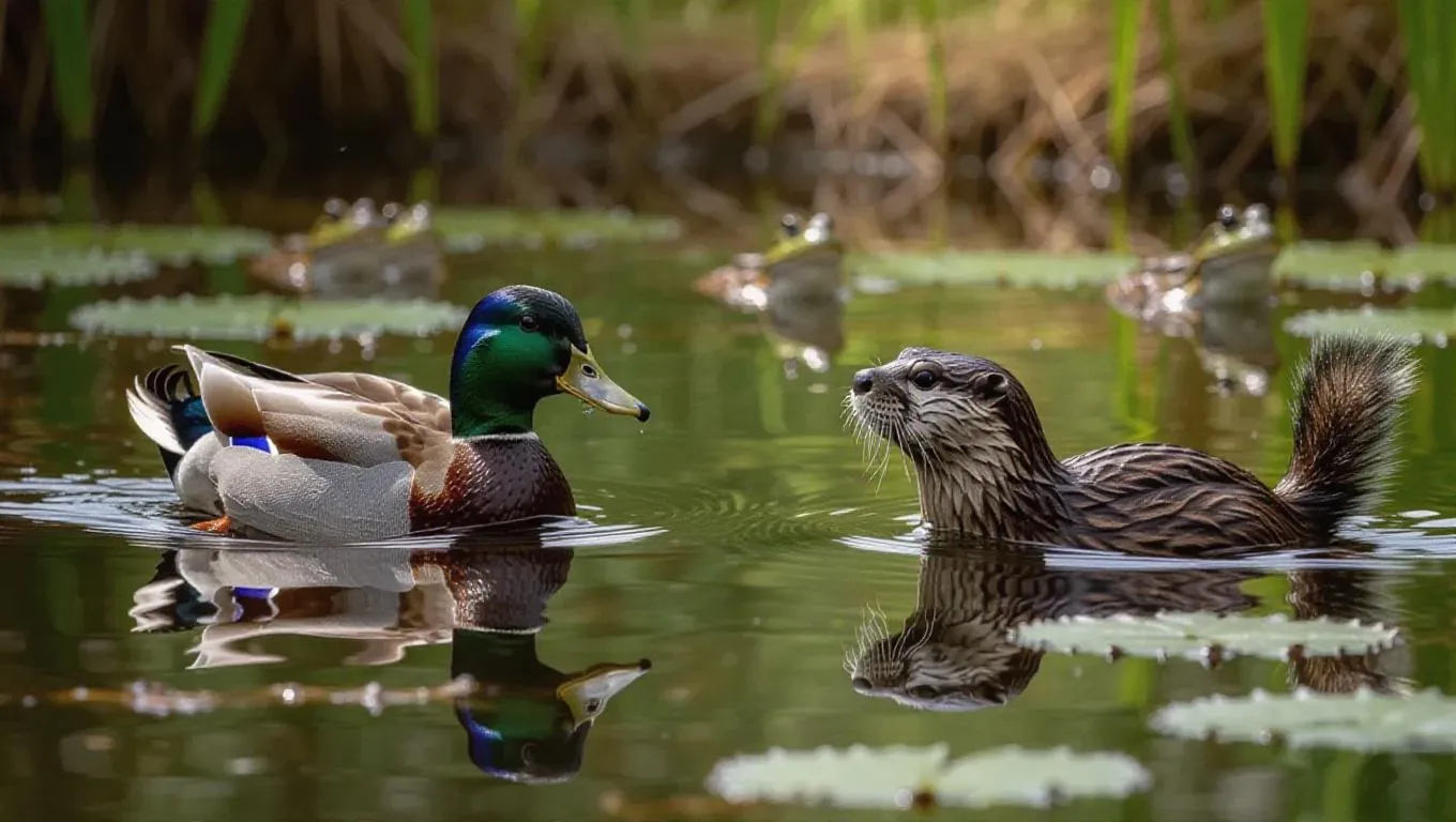 A playful swimming race in a peaceful pond features a duck, otter, and squirrel. The duck paddles swiftly, the otter glides effortlessly through the water, and the squirrel plays along the bank. Frogs and fish cheer from the water’s edge, creating a lively and festive atmosphere.