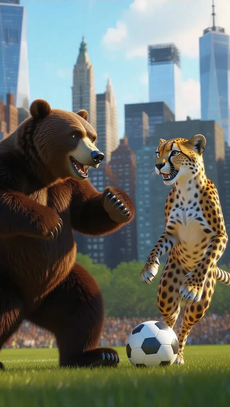 In a vibrant city sports arena, a bear and a cheetah are engaged in a friendly game of soccer. The bear's strength and power allow it to perform strong kicks, while the cheetah's agility and speed help it to dash and dribble past. The lively city skyline enhances the intensity of the game between the bear and cheetah.