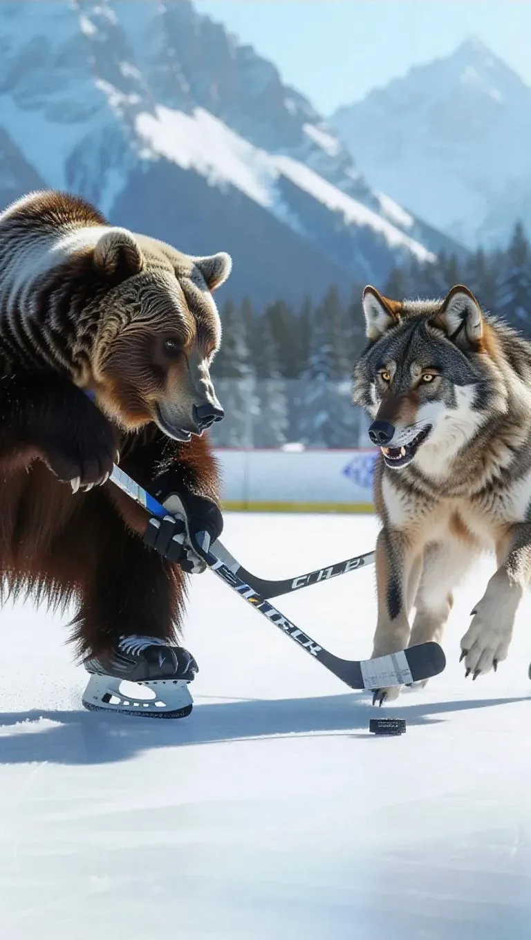 In a snowy winter sports arena, a bear and a wolf are engaged in a friendly game of ice hockey. The bear's strength and power allow it to check opponents, while the wolf's agility and speed help it to skate and shoot rapidly. The frosty mountain backdrop enhances the intensity of the game between the bear and wolf.
