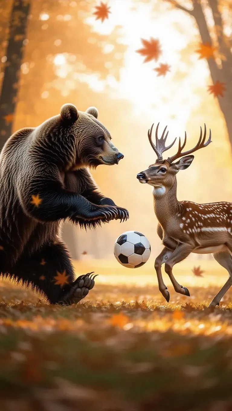 In an autumn park sports arena, a bear and a deer are engaged in a friendly game of football. The bear's strength and power allow it to tackle tough, while the deer’s agility and speed help it to outrun and score. The colorful fall leaves enhance the intensity of the game between the bear and deer.