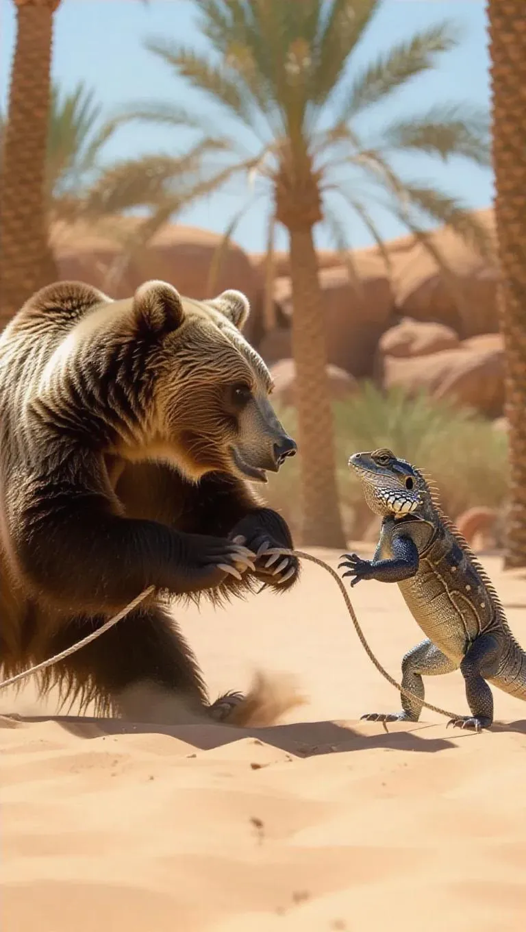 In a desert oasis sports arena, a bear and a lizard are engaged in a friendly game of tug-of-war. The bear's strength and power allow it to pull hard, while the lizard's agility and speed help it to maneuver quickly. The shimmering sands enhance the intensity of the game between the bear and lizard.