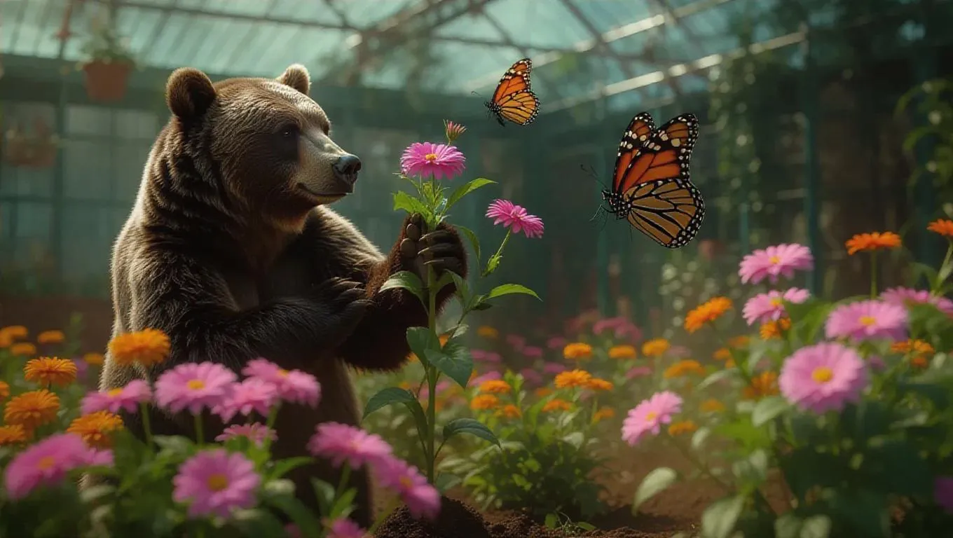 In a lively greenhouse sports arena, a bear and a butterfly are engaged in a friendly game of flower picking. The bear's strength and power allow it to uproot large plants, while the butterfly's agility and speed help it to flutter and gather nectar quickly. The blooming flowers enhance the intensity of the game between the bear and butterfly.
