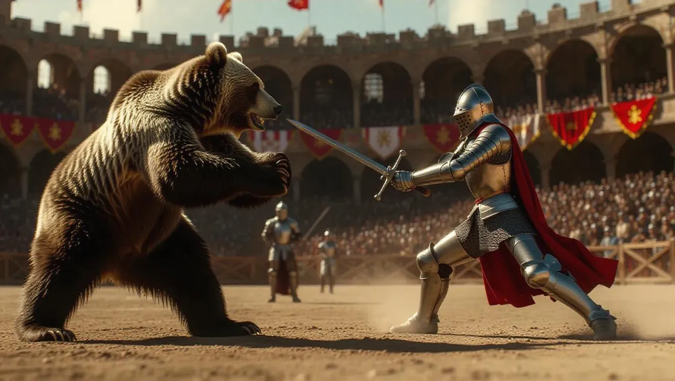 In a historical battlefield sports arena, a bear and a knight are engaged in a friendly game of jousting. The bear's strength and power allow it to strike hard, while the knight's agility and speed help it to maneuver skillfully. The dramatic battlefield enhances the intensity of the game between the bear and knight.