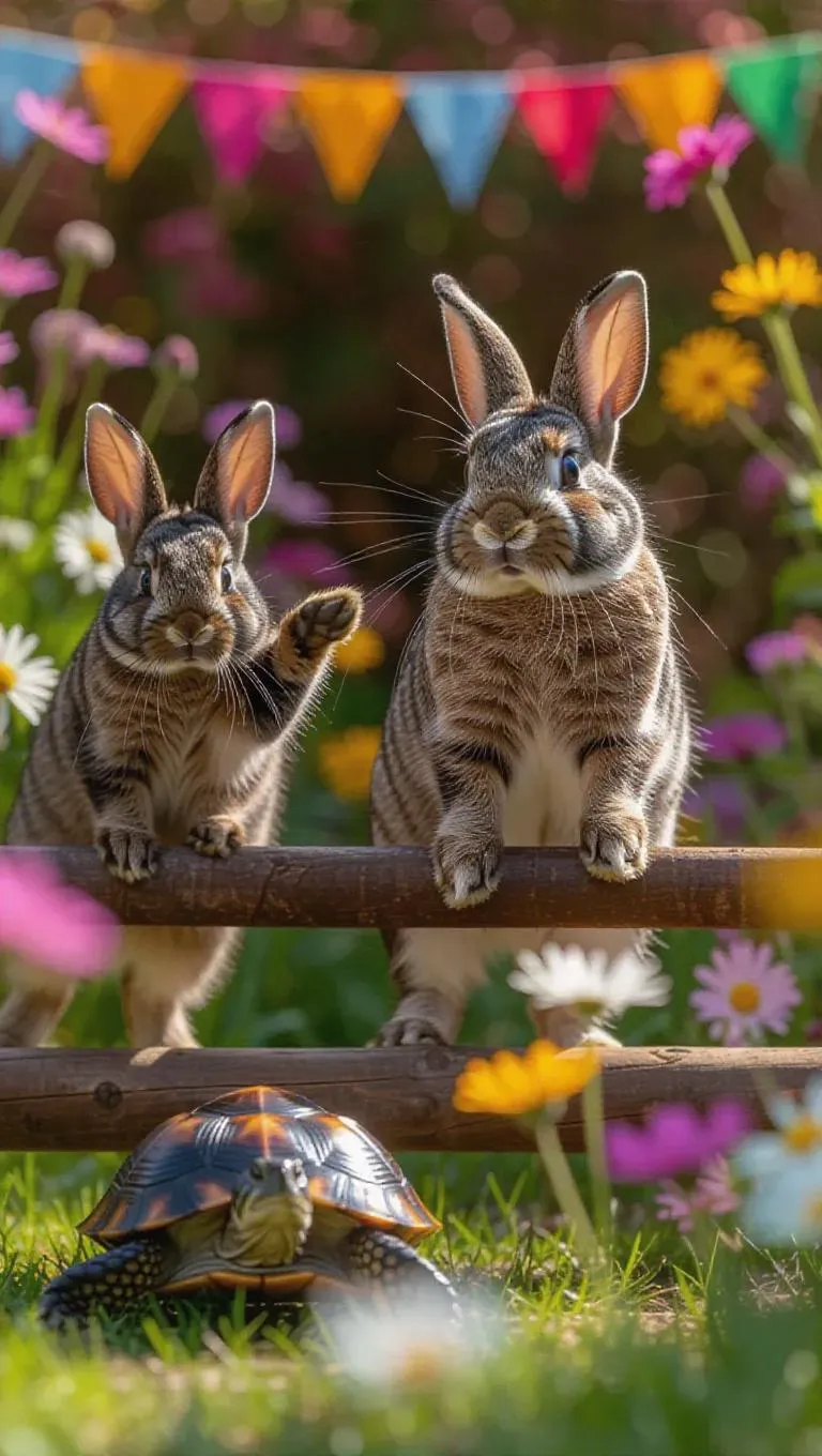 A cheerful animal sports day in a blossoming garden, where a rabbit, cat, and turtle compete in an obstacle course. The rabbit's agility helps it clear hurdles, the cat's coordination aids its navigation, and the turtle's slow method ensures it finishes strong. Animals spectate, waving handmade signs and cheering.
