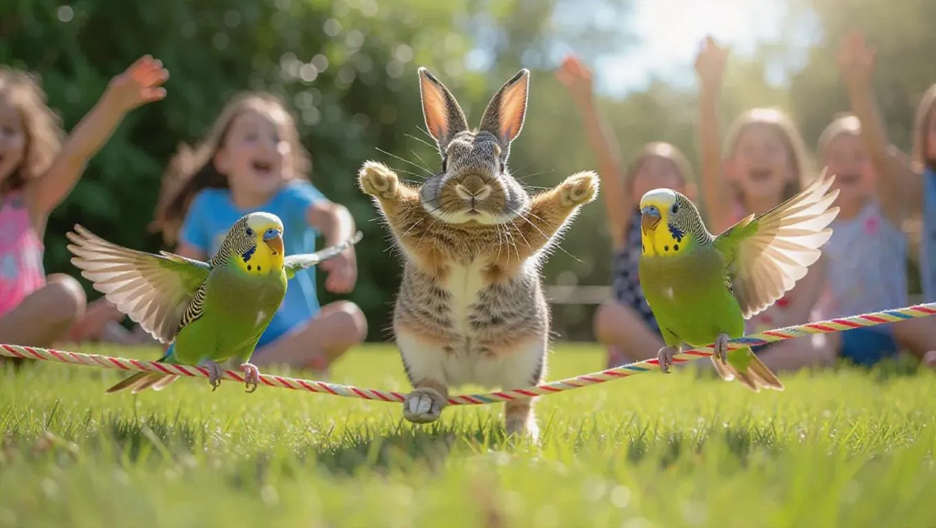 A vibrant animal sports day in a bright and sunny field, where a rabbit, parakeet, and hedgehog compete in a jump rope contest. The rabbit’s quickness helps it keep up, the parakeet’s flying helps it showcase skills, and the hedgehog’s determination shines through as it tries. Animals nearby cheer, waving their wings and making noise.