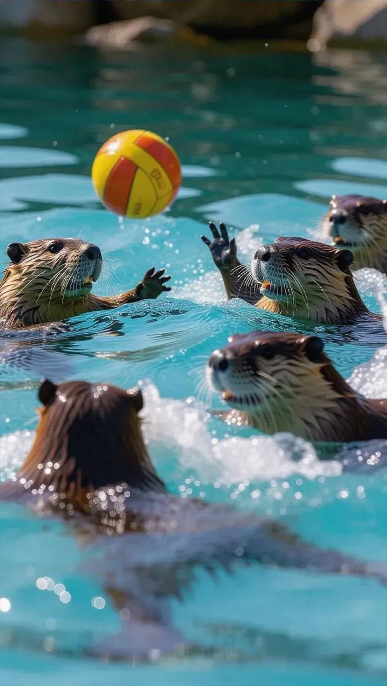 An exciting water polo match in a sparkling lake, where a team of beavers faces off against a team of otters. The beavers use their engineering skills to create structures in the game, while the otters rely on their swiftness to maneuver. The sound of splashing water and the animals’ excited chatter fills the air.