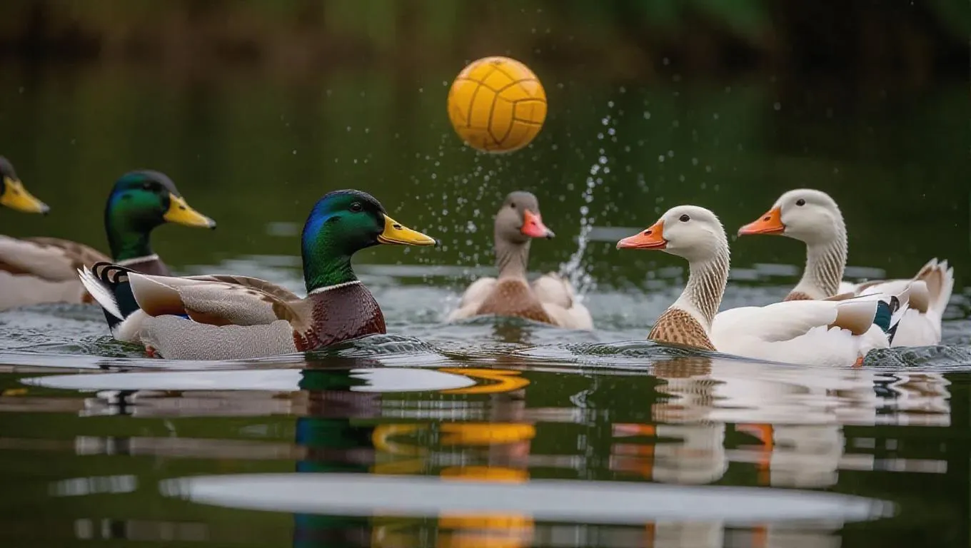A spirited water polo match in a tranquil lake, where a team of ducks faces off against a team of geese. The ducks employ their quickness, while the geese use their teamwork and honking communication. The sound of splashing water and the animals’ excited chatter fills the air.