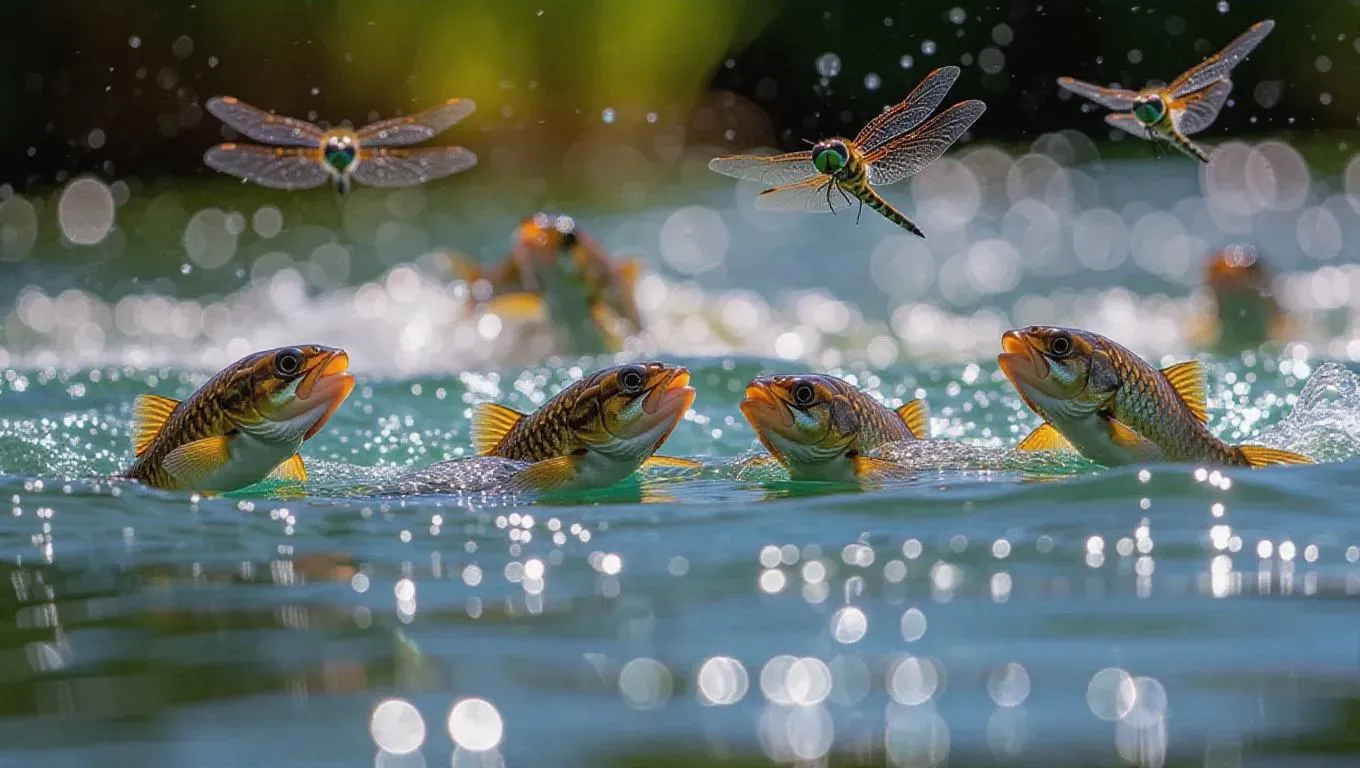 An adventurous water polo match in a shimmering creek, where a team of minnows competes against a team of dragonflies above. The minnows dart swiftly, while the dragonflies use their aerial maneuvers to strategize. The sound of splashing water and the animals’ excited chatter fills the air.