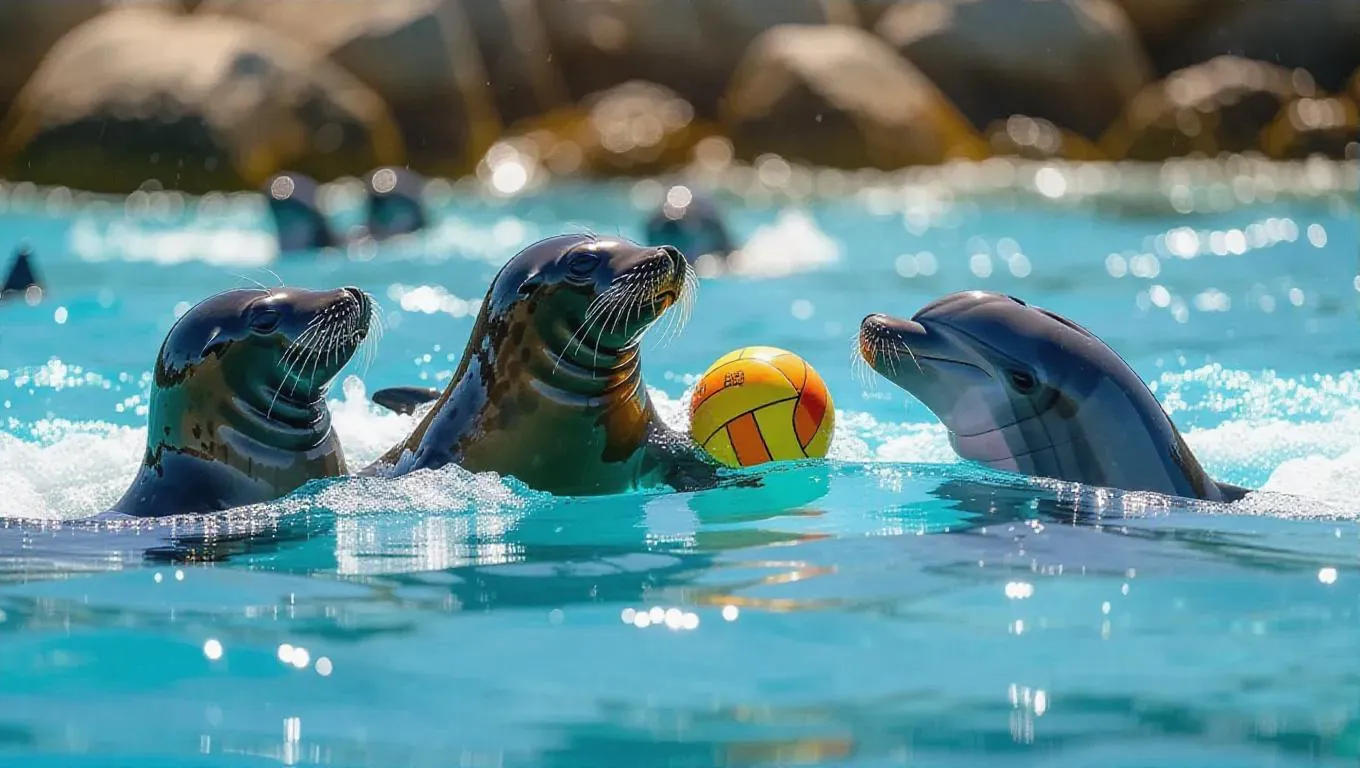 A vibrant water polo match in a sunlit bay, where a team of seals faces off against a team of dolphins. The seals employ their diving skills while the dolphins bounce energetically on the waves. The sound of splashing water and the animals’ excited chatter fills the air.