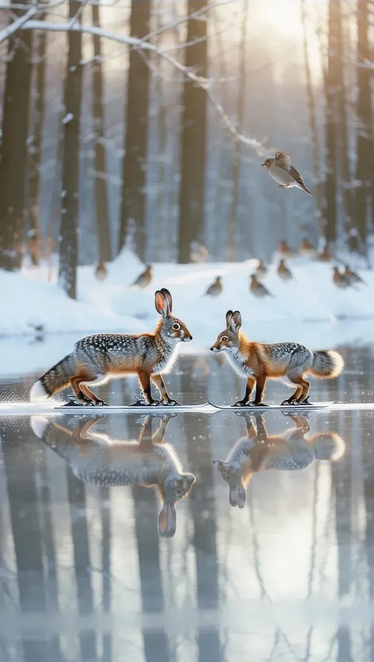 A charming speed skating race on a crystal-clear frozen pond, featuring a hare, fox, and reindeer. The hare’s quick strides give it an early lead, the fox’s agility keeps it close behind, and the reindeer’s endurance allows it to maintain a steady pace. A group of curious birds watches from the trees, their chirps adding to the excitement.