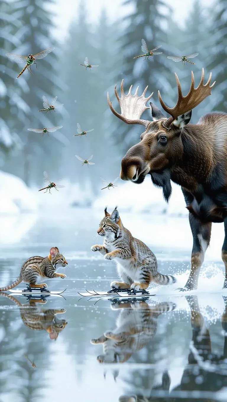 A delightful speed skating match on a glassy frozen river, starring a mouse, lynx, and moose. The mouse’s rapid dashes give it an early advantage, the lynx’s finesse keeps it closely following, and the moose’s consistency provides it with endurance. A swarm of lively dragonflies flits above, their wings contributing to the excitement.