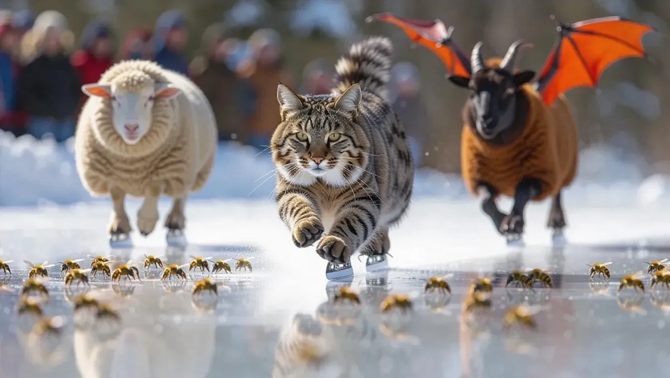 An enchanting speed skating event on a sparkling frozen surface, showcasing a bobcat, sheep, and dragon. The bobcat’s quick sprints allow it to take the lead, the sheep’s persistence keeps it in close quarters, while the dragon’s steady pace helps it remain competitive. A gathering of busy bees flutters nearby, their buzzing adding charm.