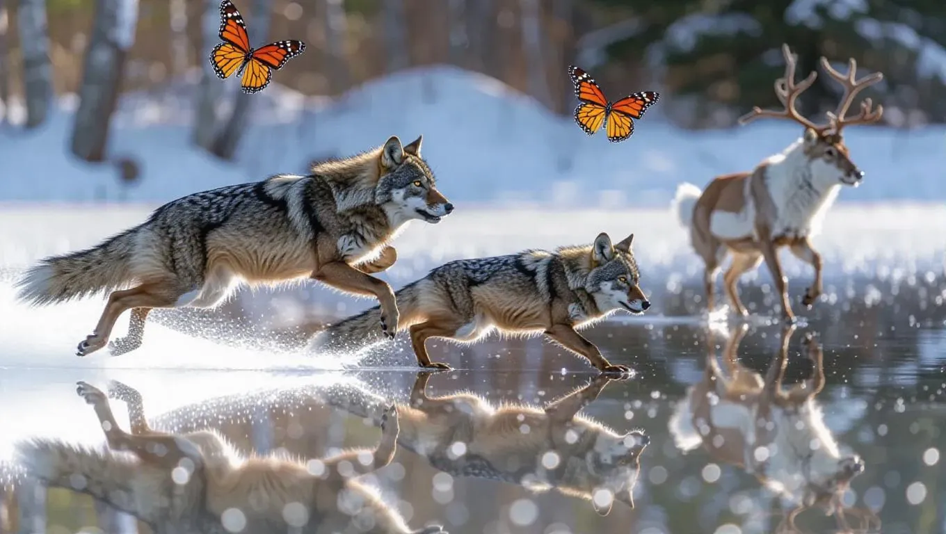A dynamic speed skating race on a crystal-clear lake, highlighting a ferret, wolf, and caribou. The ferret's zippy movements grant it a jumpstart, the wolf's agility helps it stay competitive, while the caribou's sturdy pace allows it to stay in contention. A troupe of fluttering butterflies observes closely, their wings adding finesse to the ambiance.