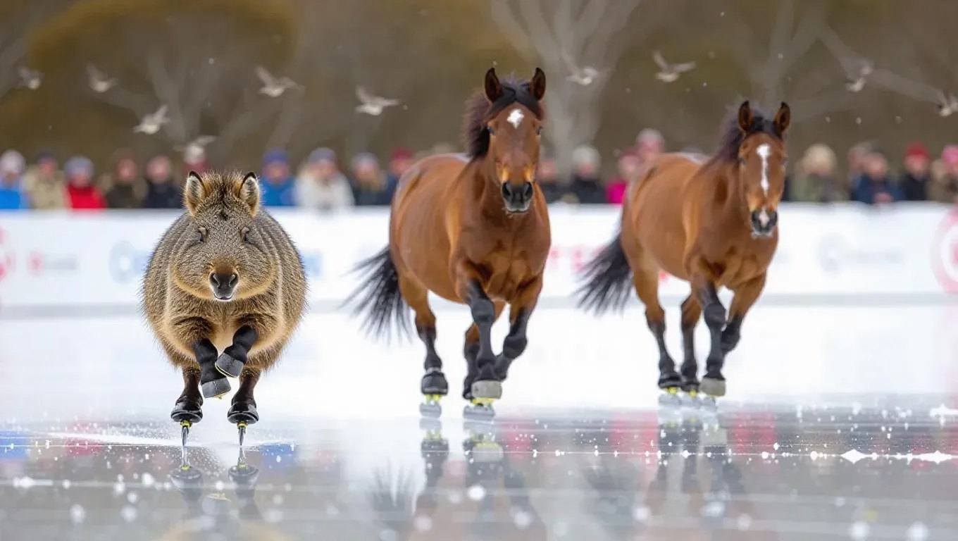An electrifying speed skating competition on a glossy ice surface, showcasing a quokka, horse, and antelope. The quokka's quick glides grant it an early lead, the horse’s endurance helps maintain its position, and the antelope’s vigor gives it a fighting chance. A gathering of small birds chirps excitedly from the branches above, their chatter enhancing the atmosphere.
