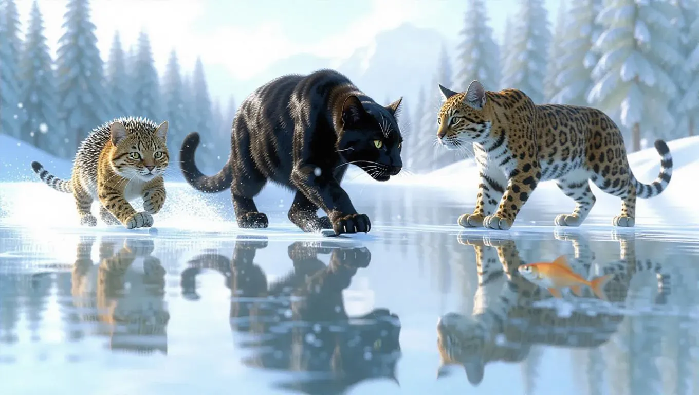An imaginative speed skating showdown on a tranquil icy surface, starring a hedgehog, panther, and feral cat. The hedgehog’s quick movements send it racing forward, the panther’s stealthy approach keeps it in the game, and the feral cat’s reliability leads to a steady pace. A group of inquisitive fish swims beneath the ice, their splashes adding excitement to the scene.