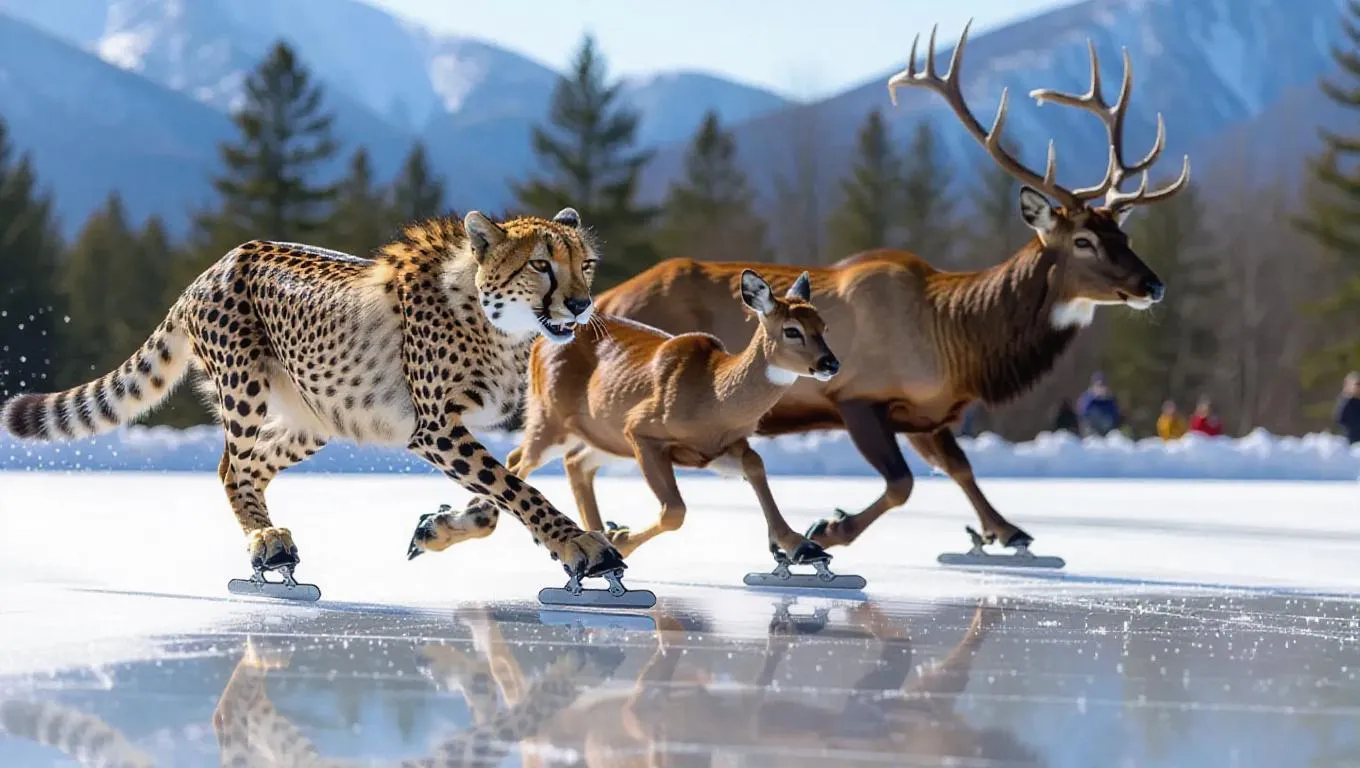 An energetic speed skating contest on a gleaming ice field, showcasing a cheetah, deer, and elk. The cheetah’s speed has it surging ahead, the deer’s quick footwork keeps it aligned, and the elk's robust build allows a steady glide. A band of chirpy crickets adds to the harmony from the sidelines, their background rhythm building the excitement.