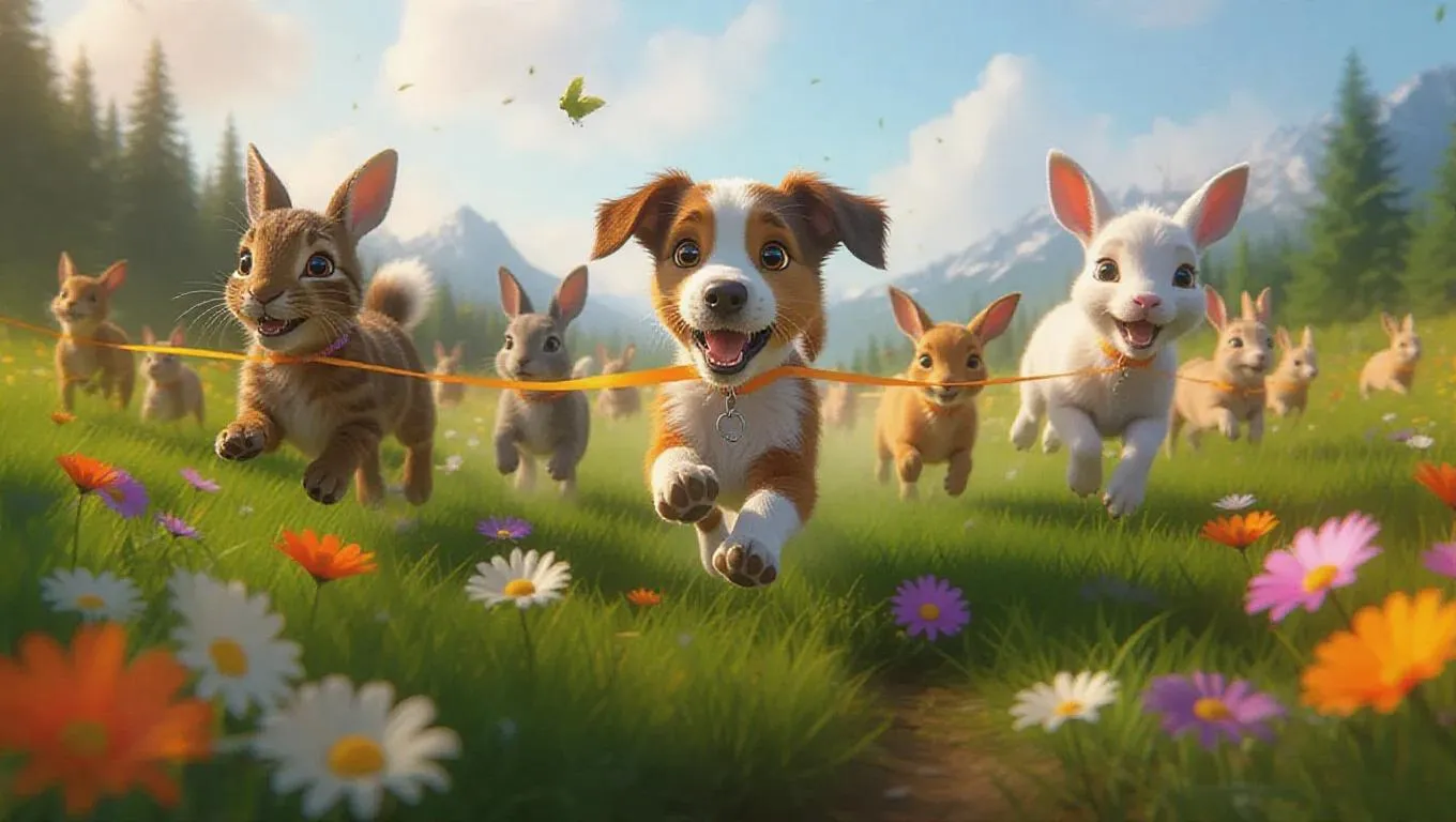 A thrilling relay race takes place in a sprawling meadow, with teams of animals passing a bright ribbon. A puppy, rabbit, and lamb form one team, while a kitten, goat, and frog make up the other. The animals run with joy, their teamwork and speed on full display as flowers bloom all around.