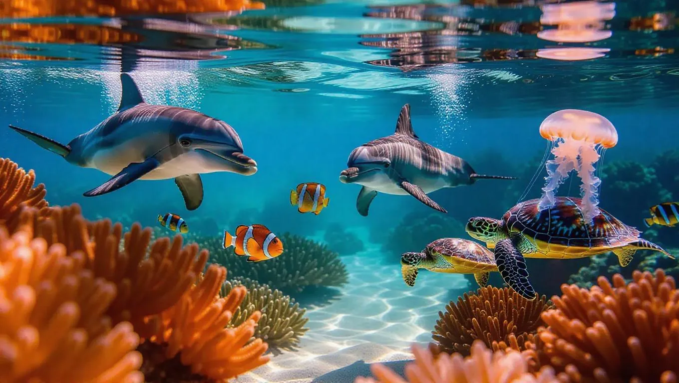 A thrilling relay race takes place in an underwater setting, with teams of sea creatures passing a shiny shell. A dolphin, fish, and sea turtle form one team, while a jellyfish, crabs, and octopus make up the other. The animals swim gracefully, their teamwork and speed on full display as the coral reef glows.