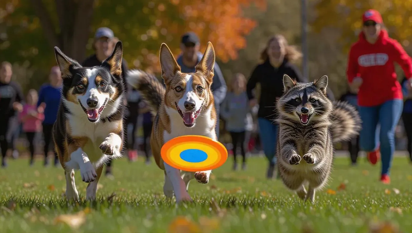A thrilling relay race takes place in an urban park, with teams of animals passing a colorful frisbee. A dog, rabbit, and squirrel form one team, while a cat, raccoon, and bird make up the other. The animals sprint forward, their teamwork and speed on full display as the onlookers cheer.