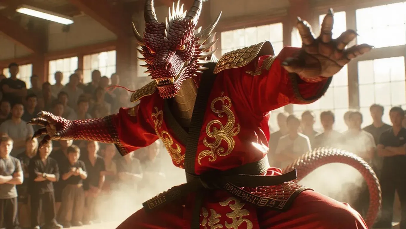 An anthropomorphic dragon gladiator flies into a karate gym, adorned with ornate red and gold karate gi with a black belt. His scales shimmer as the camera pans from his claws to his piercing eyes. The crowd gasps, smoke billows, and fiery lighting engulfs the area, enhancing his magnificent appearance. The atmosphere is awe-inspiring filled with wonder.