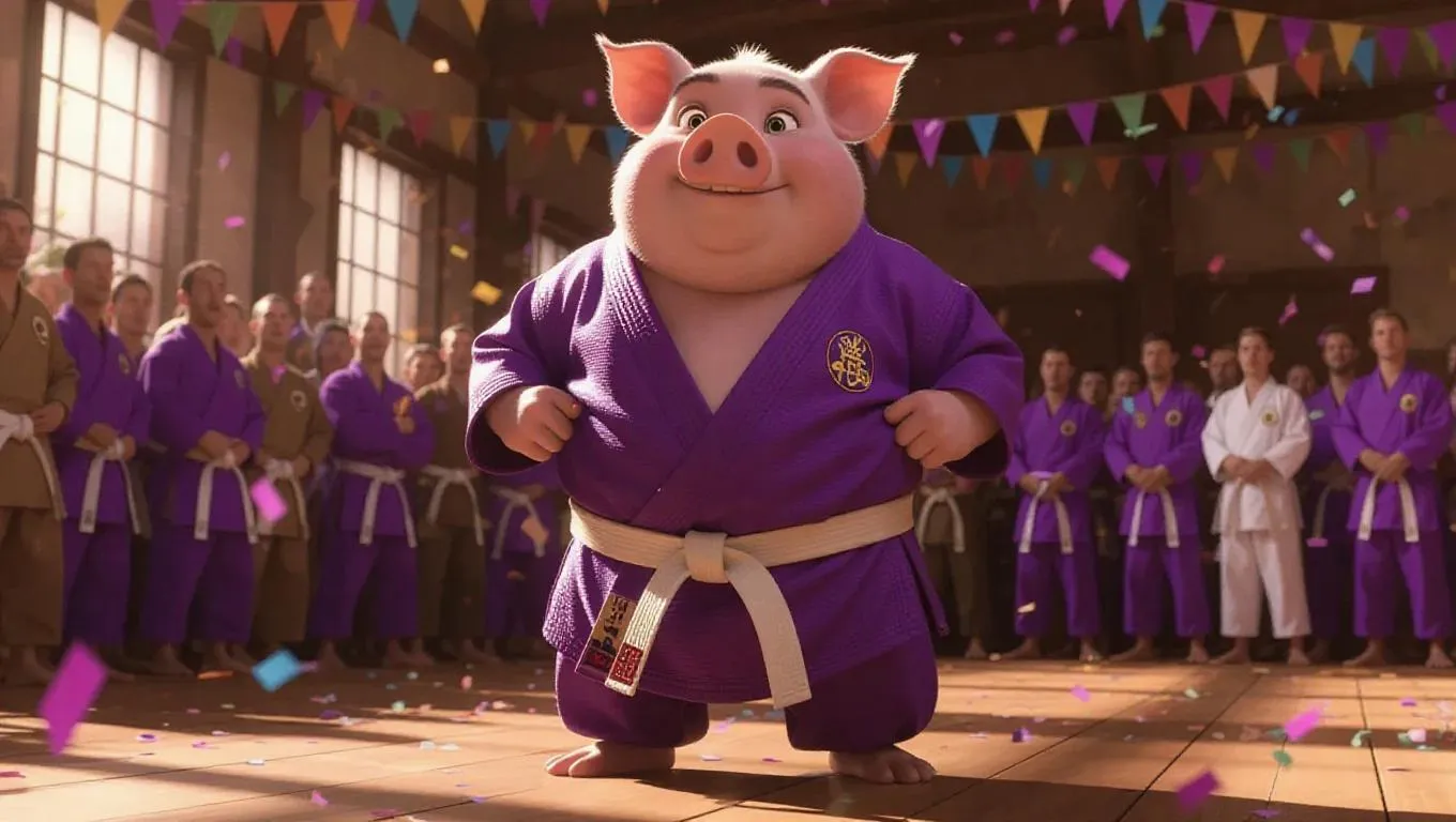 An anthropomorphic pig gladiator strolls into a karate dojo, wearing a sleek purple karate gi with a white belt. His round frame draws attention as the camera pans from his sturdy legs to his unwavering stare. The crowd laughs uproariously, confetti drifts, and playful lighting sets a cheerful tone, bringing life to his charming character. The atmosphere is jovial and lively.