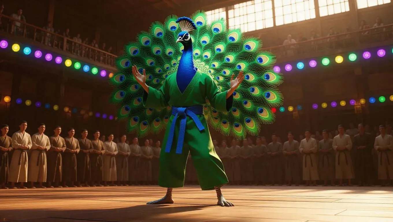 An anthropomorphic peacock gladiator struts into a traditional dojo, dressed in vibrant green karate gi with a blue belt. His feathers fan out dramatically as the camera pans from his feet to his proud expression. The crowd gasps, colored lights dance, and opulent lighting enhances the brilliance of his entry. The atmosphere is dazzling with excitement.