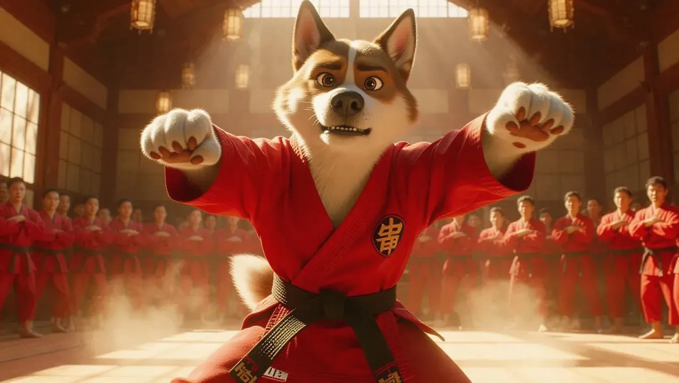 An anthropomorphic dog gladiator bounds into a karate studio, donning a red and white karate gi with a black belt. His muscular build is on display as the camera pans from his paws to his loyal eyes. The audience erupts in cheers, dust swirls, and bright spotlights highlight his courageous stance. The atmosphere is electric with enthusiasm.