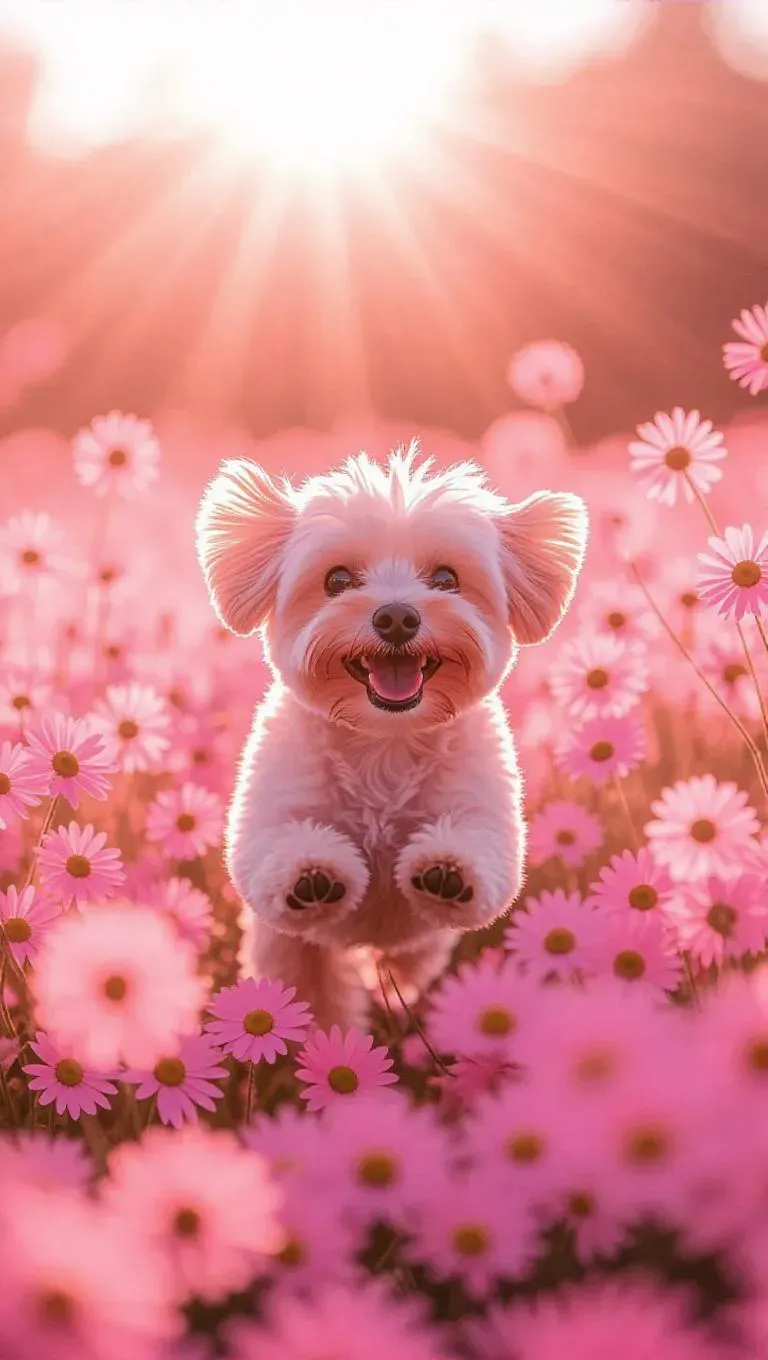 A pastel pink world where a small dog is running through a field of pink daisies. The sun is shining brightly, casting a soft pink glow on the dog’s fur. The scene feels lively and cheerful.