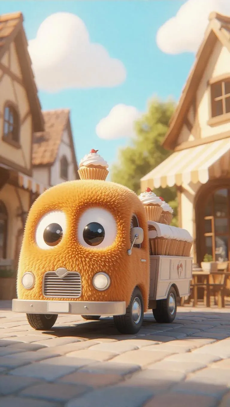 A fluffy, Jellycat-style bakery truck with soft, rounded edges and large, expressive eyes is parked beside a quaint café in a warm, inviting town. Its body is covered in plush, brown fur, with white paws and a tiny, adorable cupcake on top. The clear blue sky above is dotted with fluffy clouds, and soft, warm sunlight filters through, casting gentle shadows and highlighting the truck's cuddly texture. The scene exudes a playful, whimsical charm, perfect for a children's storybook.
