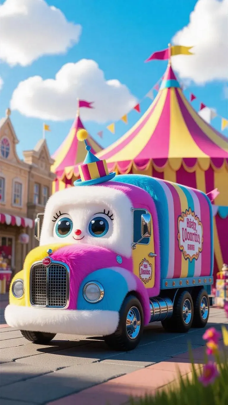 A fluffy, Jellycat-style circus truck with soft, rounded edges and large, expressive eyes is parked beside a colorful big top in a festive, vibrant town. Its body is covered in plush, multicolored fur, with white paws and a tiny, adorable clown hat on top. The clear blue sky above is dotted with fluffy clouds, and soft, warm sunlight filters through, casting gentle shadows and highlighting the truck's cuddly texture. The scene exudes a playful, whimsical charm, perfect for a children's storybook.