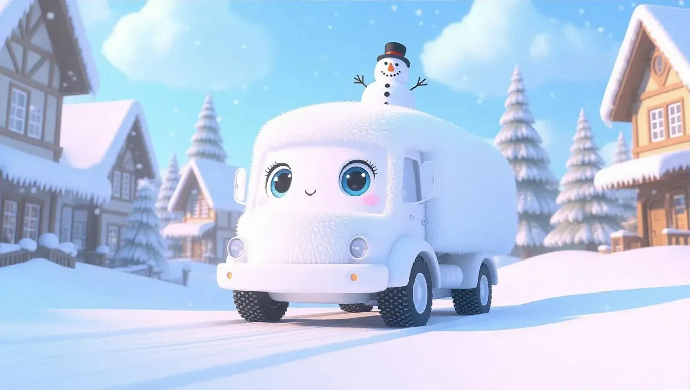 A fluffy, Jellycat-style ice truck with soft, rounded edges and large, expressive eyes is parked beside a snowy hill in a wintry, frosty town. Its body is covered in plush, white fur, with white paws and a tiny, adorable snowman on top. The clear blue sky above is dotted with fluffy clouds, and soft, warm sunlight filters through, casting gentle shadows and highlighting the truck's cuddly texture. The scene exudes a playful, whimsical charm, perfect for a children's storybook.