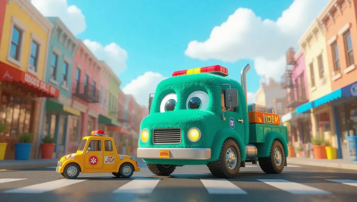 A fluffy, Jellycat-style rescue truck with soft, rounded edges and large, expressive eyes is parked beside an emergency rescue site in a bustling, neon-colored town. Its body is covered in plush, emerald fur, with white paws and a tiny, adorable rescue kit on top. The clear blue sky above is dotted with fluffy clouds, and soft, warm sunlight filters through, casting gentle shadows and highlighting the truck's cuddly texture. The scene exudes a playful, whimsical charm, perfect for a children's storybook.