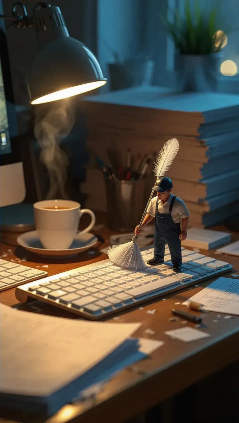 A tiny janitor with a miniature feather duster meticulously cleans a full-sized Mac keyboard on a cluttered office desk, surrounded by scattered papers, a steaming tea cup, and a flickering desktop monitor, capturing the essence of a late-night office cleanup, bathed in soft, ambient lighting, with a sense of quiet determination.