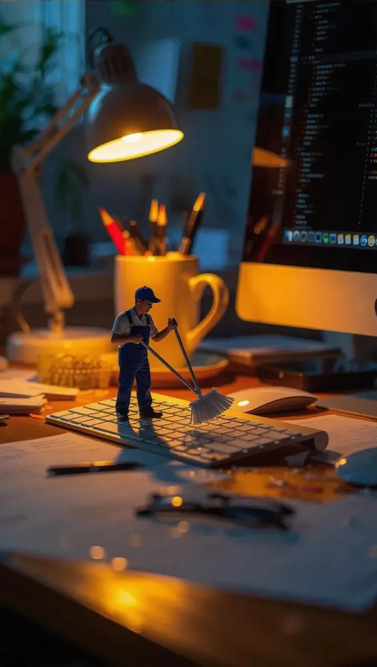 A tiny janitor with a miniature mop carefully washes a full-sized Mac keyboard on a chaotic office desk, surrounded by messy files, a half-empty coffee mug, and a glowing desktop monitor, capturing the essence of an early morning office tidying, illuminated by bright, direct light, with a feeling of energetic resolve.