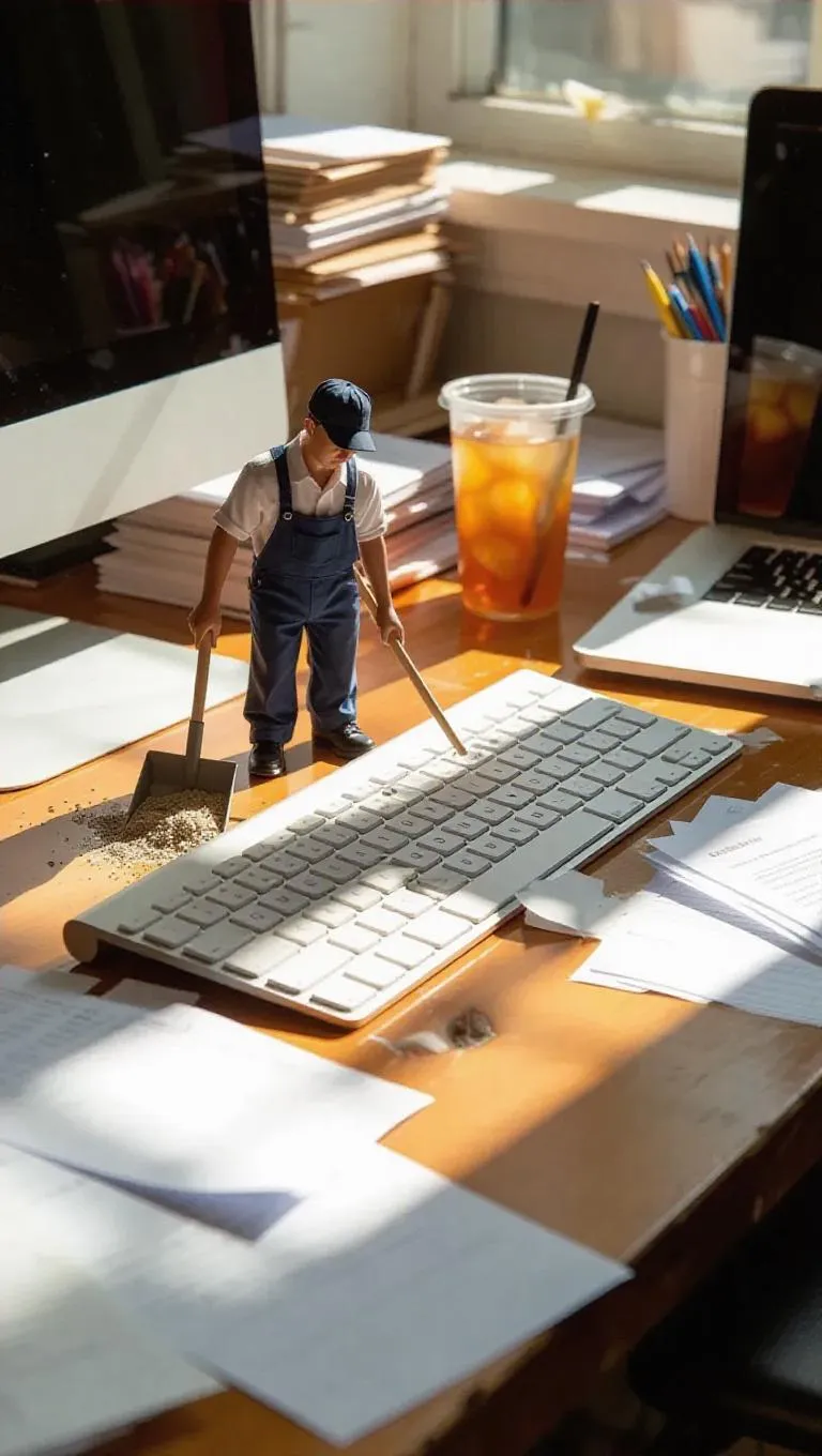 A tiny janitor with a small dustpan carefully collects crumbs around a full-sized Mac keyboard on a chaotic office desk, surrounded by loose papers, an iced tea glass, and a laptop, capturing the essence of a hot afternoon office cleanup, framed by harsh, work-focused lighting, with an atmosphere of escalating determination.