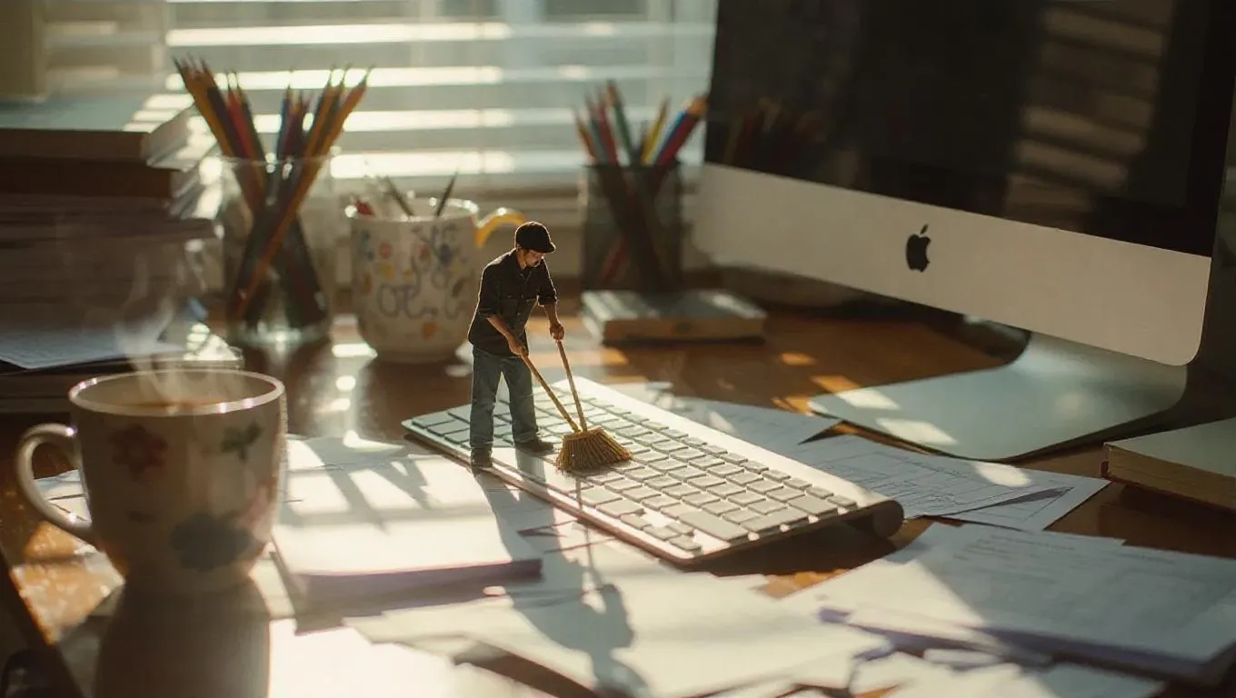 A tiny caretaker with a tiny broom methodically cleans a full-sized Mac keyboard on a messy office desk, surrounded by loose sheets, a steaming mug of tea, and a muted monitor, capturing the essence of a late-night office tidy-up, under dimly lit shadows, with a feeling of soft determination.
