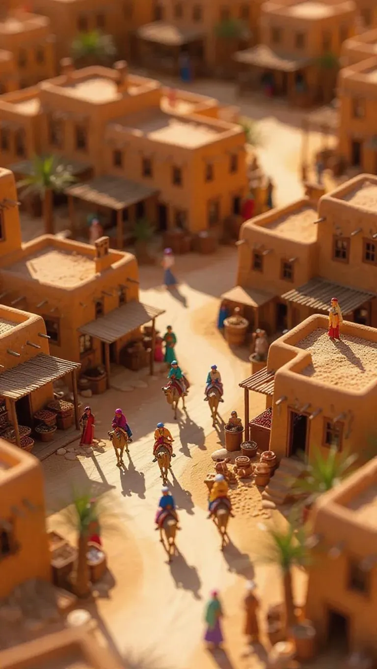 A miniature desert town with adobe houses, sandy streets, and a small plaza. Tiny people enjoying the sunshine, some riding camels, others shopping for spices. Warm, golden sunlight casts a vibrant glow, enhancing the lively and colorful atmosphere.